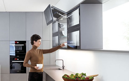 En principio, un mueble abatible es mas incomodo que uno batiente, al menos desde el punto de vista de la apertura, debemos cargar con todo el peso de la puerta al abrirlo, a menos que contemos con un herraje que ejerza esa fuerza por nosotros. Y aquí es donde entran los sistemas de alzamiento, comenzamos con herrajes con muelles y pasamos por los pistones, estos herrajes son rudimentarios y suelen tener una vida corta, comparada con la del resto del mobiliario. Existen otros sistemas mas sofisticados, estos los encontrábamos en las cocinas de alto nivel, hoy en día se han normalizado y sus precios han bajado bastante.