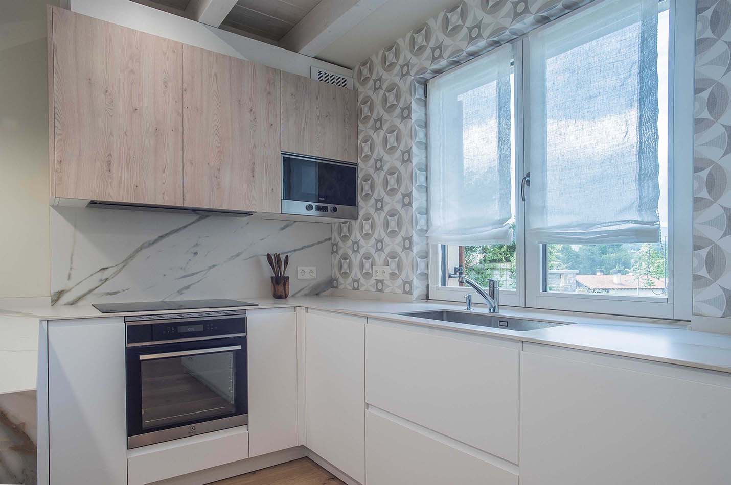 Para lograr este doble efecto, se planteó una distribución en L. Sin embargo, debido al gran espacio disponible, esta distribución no era suficiente para este proyecto en particular. El espacio destinado a la cocina y nuestra fabricación a medida, hizo posible una cocina con península que encaja a la perfección y que aprovecha al milímetro el espacio destinado para esta estancia del hogar. De este modo se diseñó una cocina en U, dejando el lateral más próximo al salón libre (península) que supera los retos de este proyecto. La península delimita perfectamente el espacio que conforma la cocina, pero además tiene función de mesa auxiliar abierta al resto del espacio.
