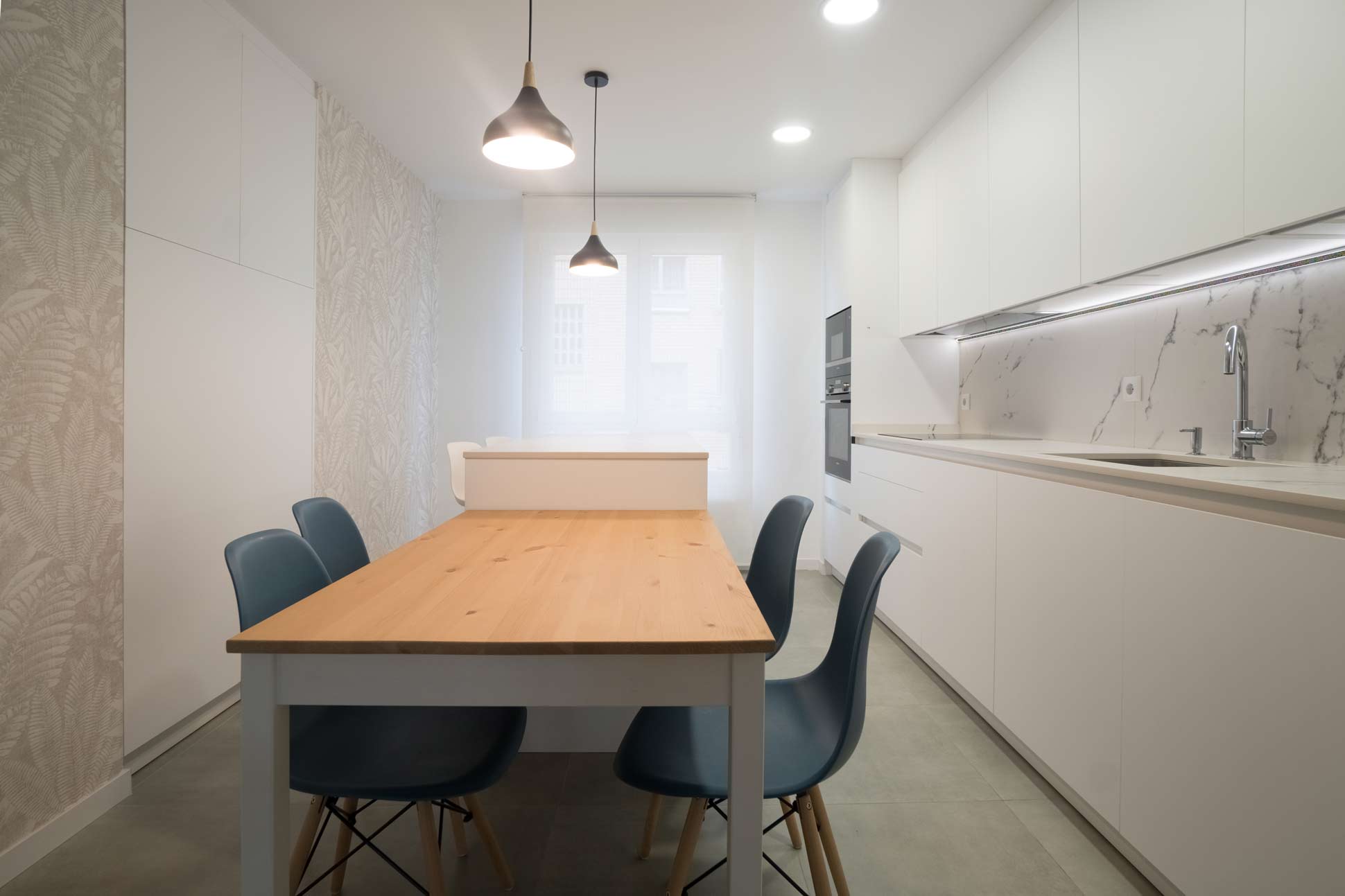 El cliente lo tenía muy claro, buscaba una cocina luminosa, minimalista, sencilla y con encanto. Una cocina para el día a día, que invitase a pasar tiempo en ella y en la que poder reunirse. De este modo a raíz del estudio del espacio, se siguió una distribución lineal donde se concentró el cuerpo y alma de esta cocina, para complementar este diseño con la incorporación de una isla y una mesa.